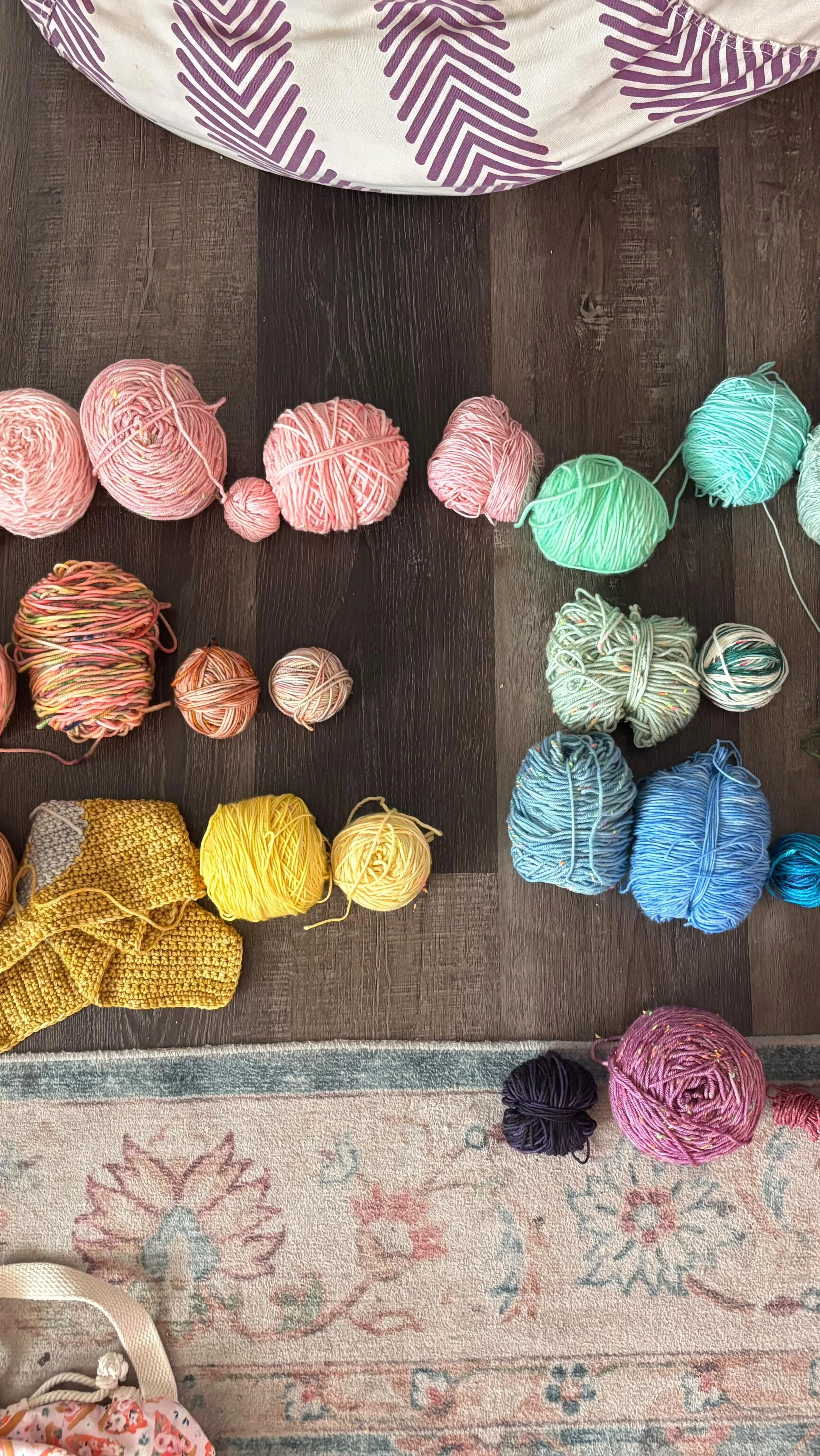 Rainbow skeins of yarn arranged in a row on a pink surface, with a mug of hot chocolate, a plate with a brownie, and a bouquet of dried flowers nearby.